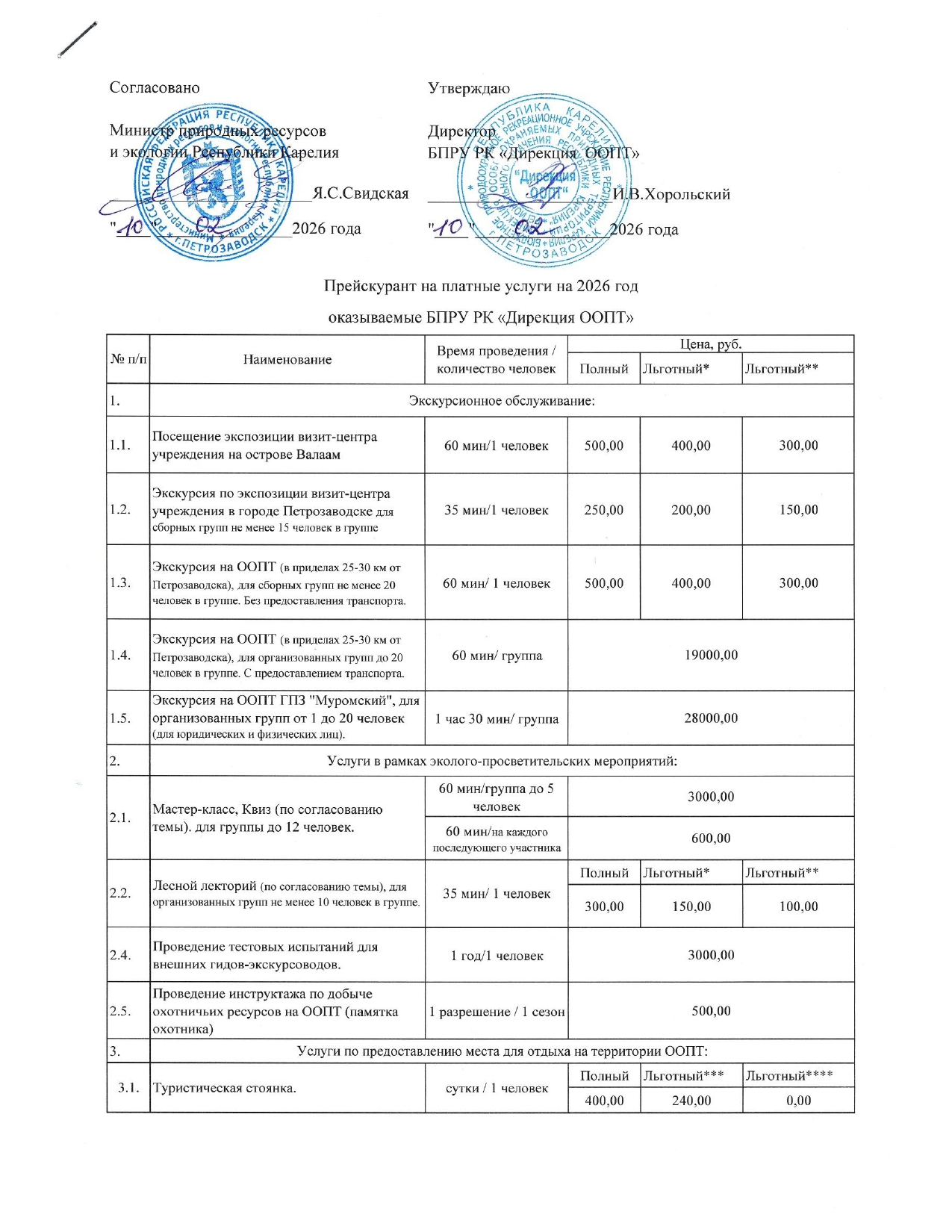 Прейскурант на платные услуги на 2026 год оказываемые БПРУ РК "Дирекция ООПТ"